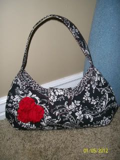 Now that I have a little more time on my hands I can make purses ready for purchase!! This is a clutch size it is a black and white floral pattern with red stitching and 3 cute red fabric rose buds on the front!! If interested call or email:)